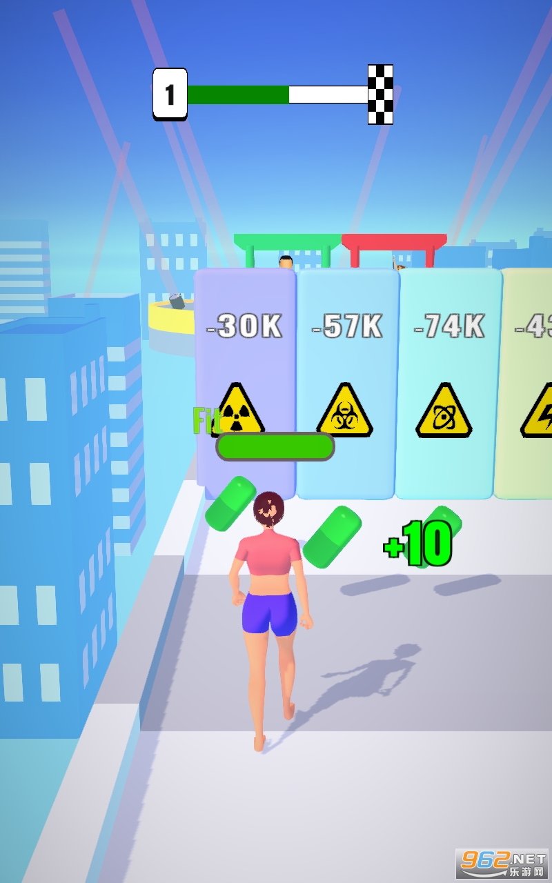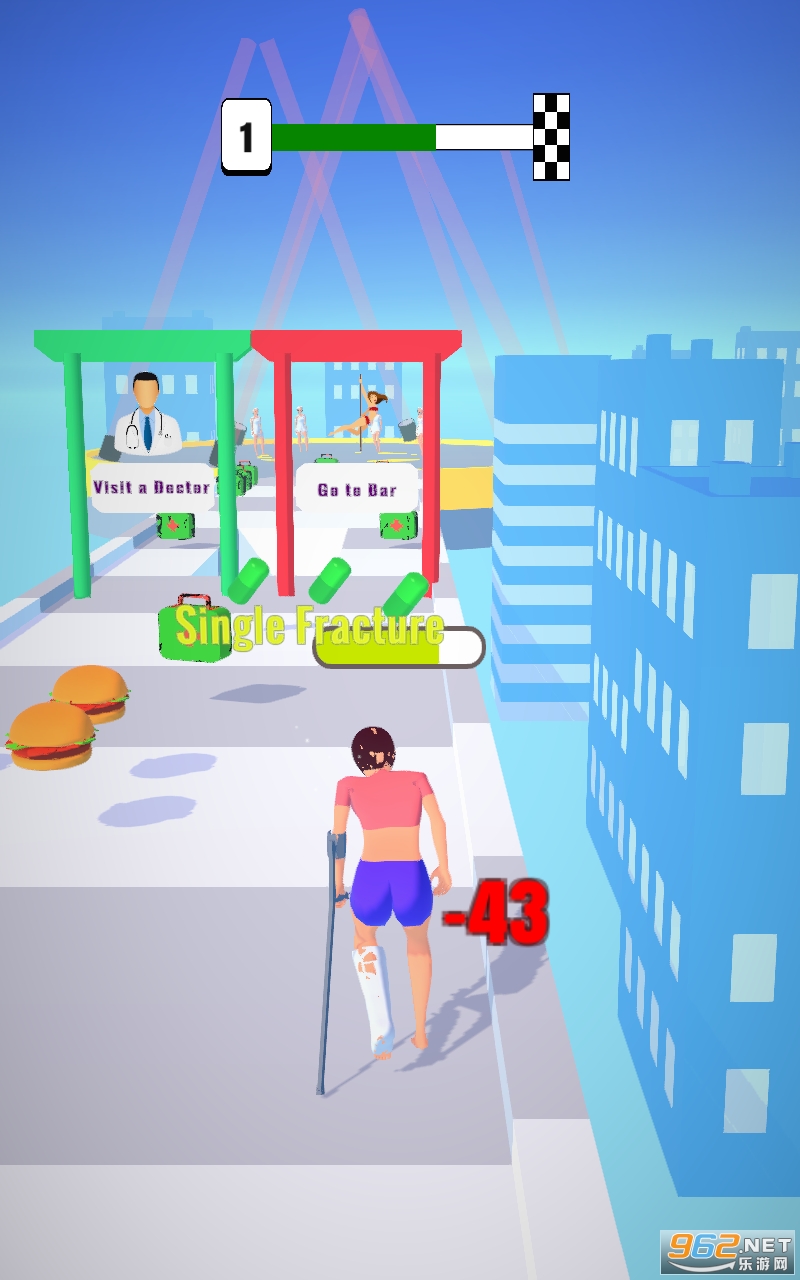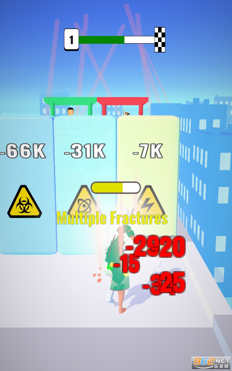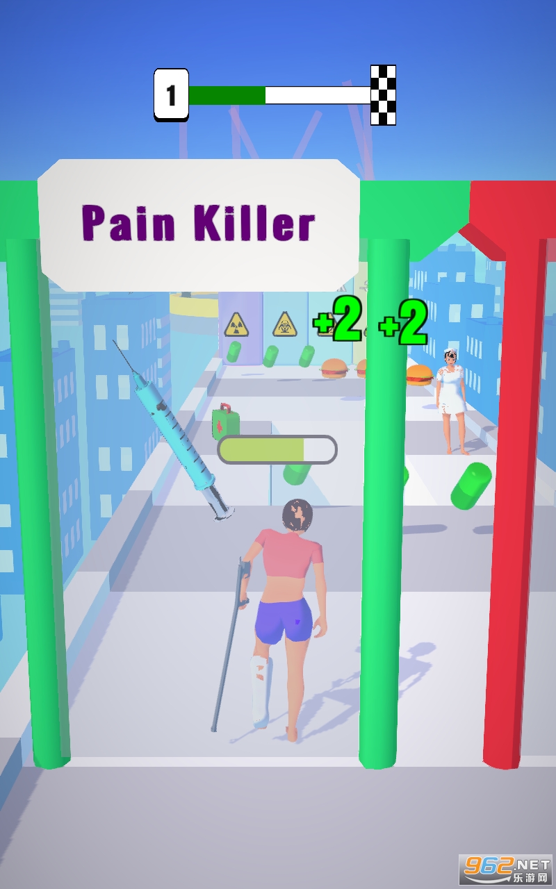 2、左右滑动屏幕控制小人移动,收集路径上的药、医疗箱,通过治疗、护士或大夫的门