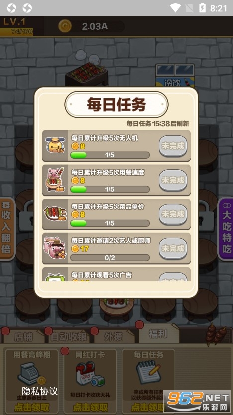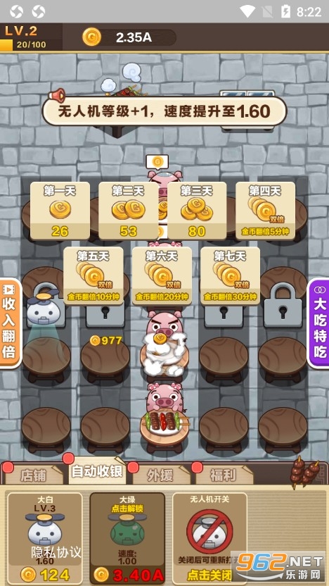 《烧烤俱乐部》是一款好玩的经营烧烤店游戏,有更多创新玩法的经营模式,使用无人机服务员,每天的任务还是很多的,完成任务获得更多金币奖励,然后使用获取的这些金币去升级我们的烧烤店,将烧烤店的规模越做越大,相信大家能在经营的过程中收获许多快乐。