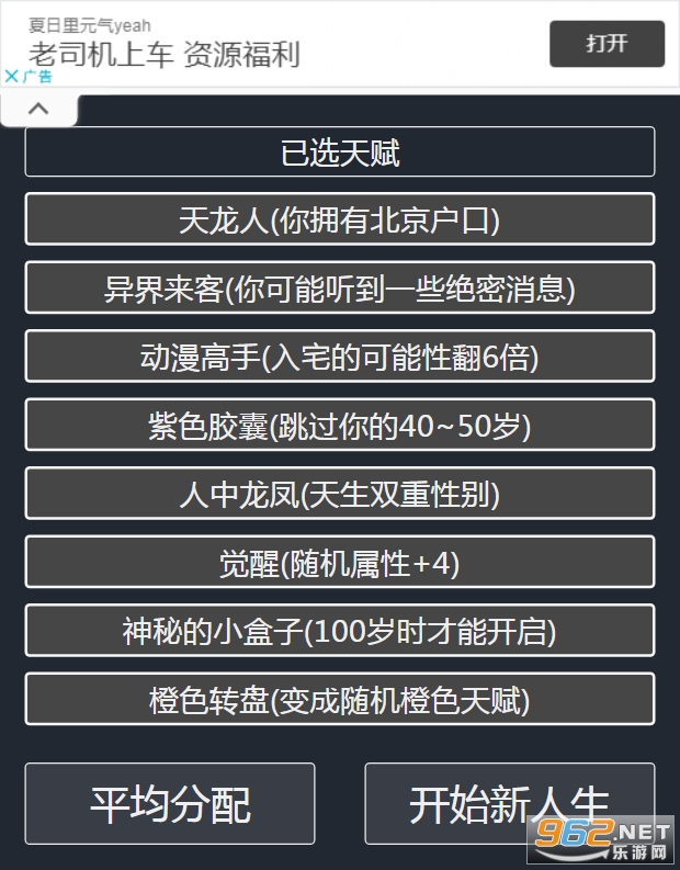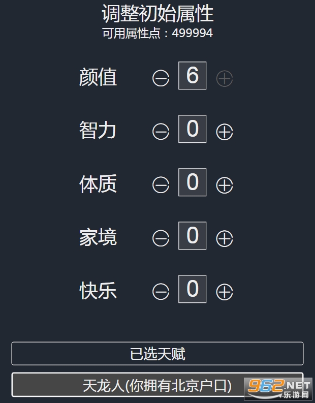 2、随机的获得起始的属性,比如说天赋,体质,家境,智力,美貌等等不同的属性安排。