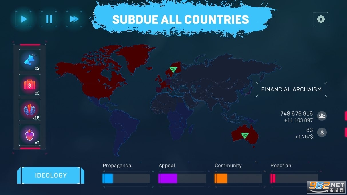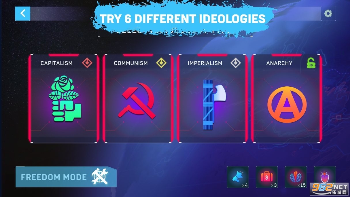 游戏具有 6 种虚构的政治意识形态:共产主义、资本主义、帝国主义、无政府状态、生态主义和军国主义。每种意识形态都有独特的升级、游戏机制和分发功能。
