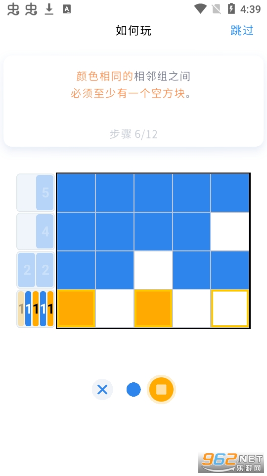 -相同的颜色组至少需要一个空白方块进行分开。