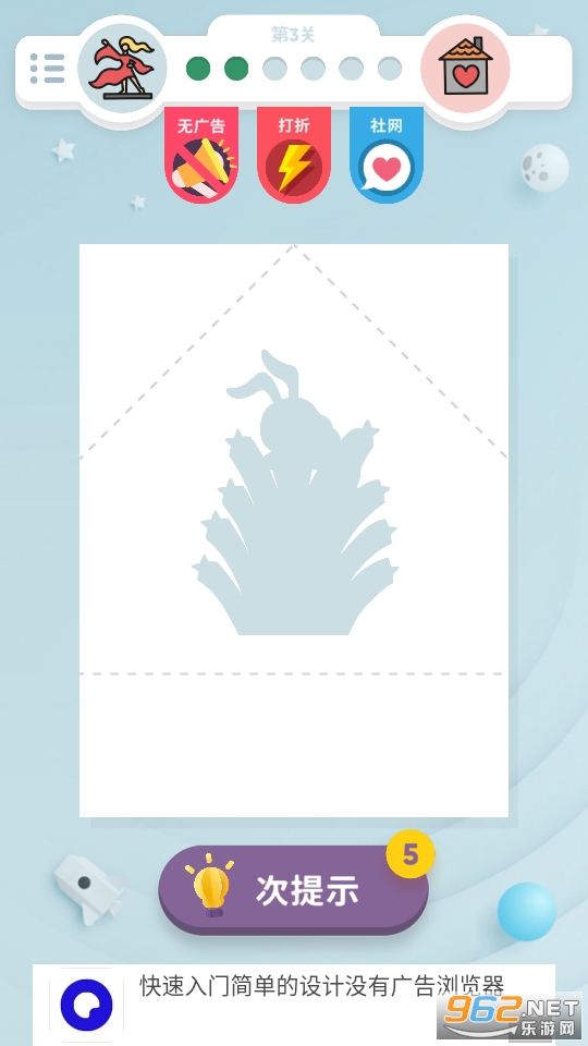 一款非常有趣的以折纸玩法为核心的益智休闲游戏,玩家在游戏中只需要进行折纸闯关就可以了。丰富的关卡,难度逐步的进行提升,快来下载吧!