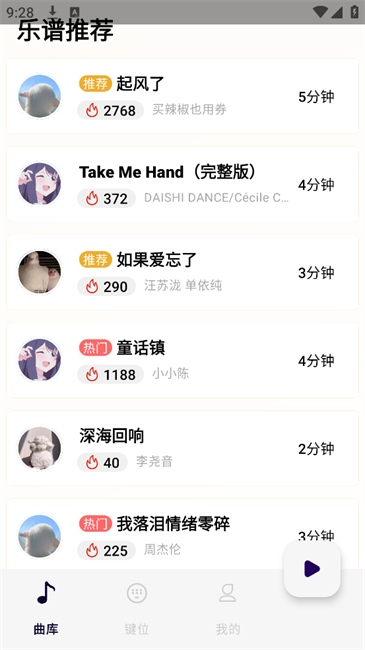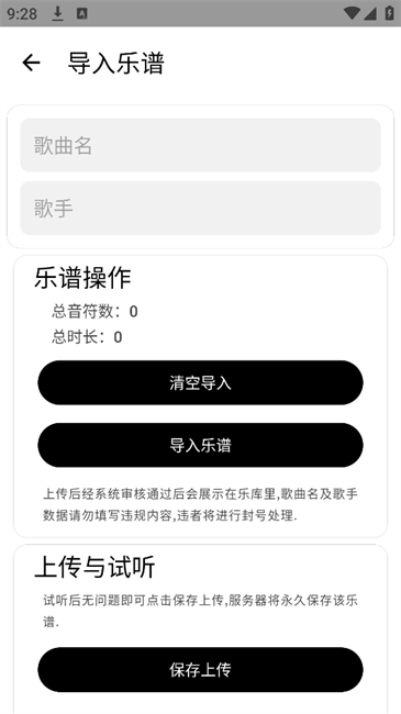 用户可自己弹奏乐谱上传共享,也可以直接导入乐谱文件。