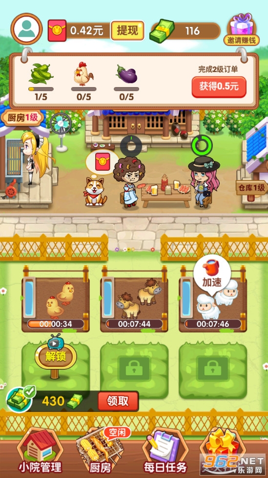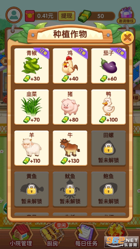 一起来撸串是一款模拟经营类游戏,玩家通过种植作物获取食材,在厨房加工食材获得烤串,接待客人,来经营老板娘的烧烤店。种植农作物,养殖鸡鸭牛羊、龙虾海鲜,制作烧烤串串,完成客户订单,招待客人,都能获得现金红包奖励。