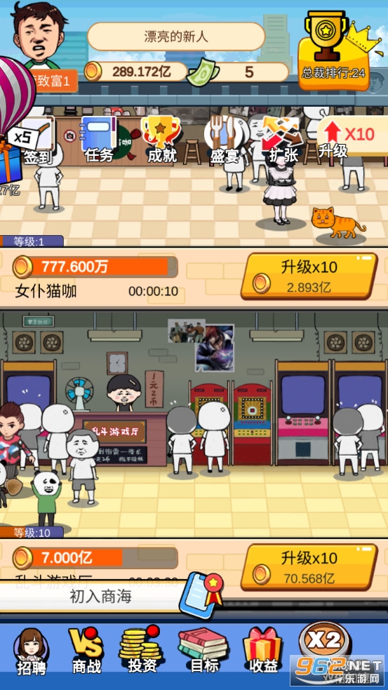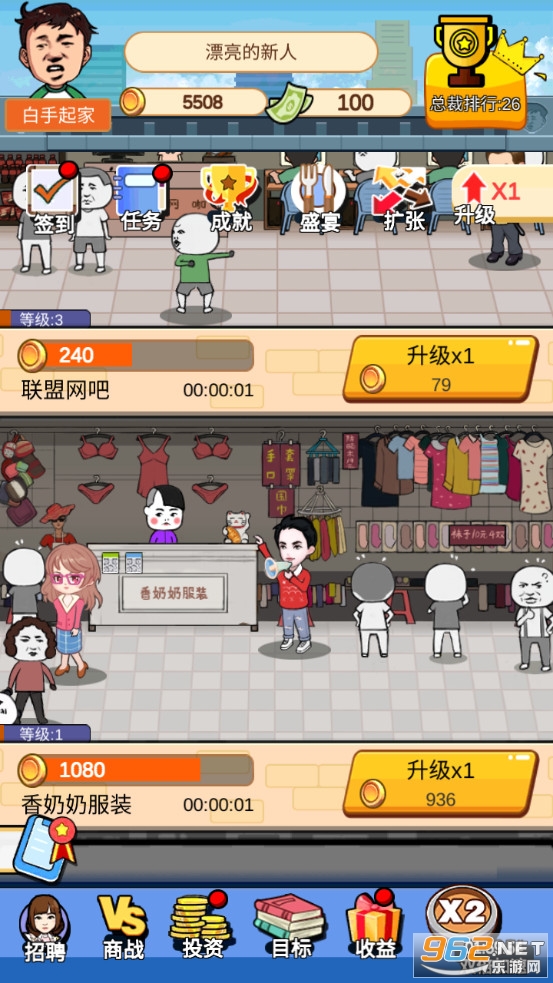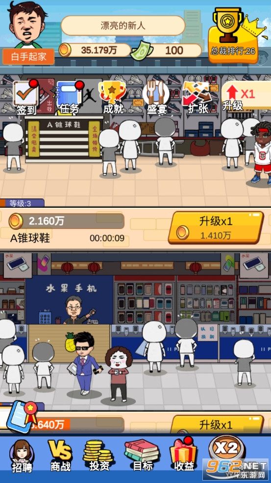《俺也能逆袭》是一款画面清新的放置经营养成类休闲手游,游戏中玩家将从一个小白开始创业,可以开设鞋店、手机店、娃娃机电、游戏厅、电影院等各种项目,可以通过升级来提高单位时间的效益,可以进行投资,可以与各种名人聚会来提高自己的知名度,不断的赚钱成为首富。