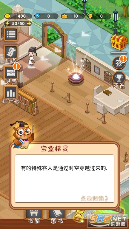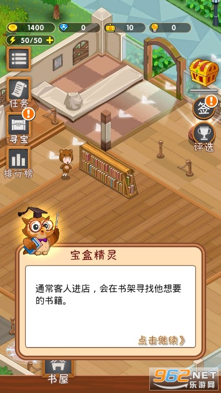 玩家可以疯狂点击月光宝盒手动召唤客人,每间隔一定的时间就能去召唤客人,如果客人找不到想要的书就会直接走掉,所以我们需要不断的藏书,购置更多的书架,让书店的藏书越来越多。