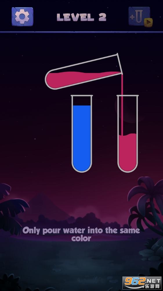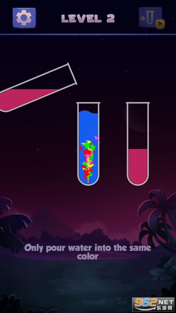 你只能倒,如果两个管在上面有相同的颜色并有自己的空间才能容纳更多的水