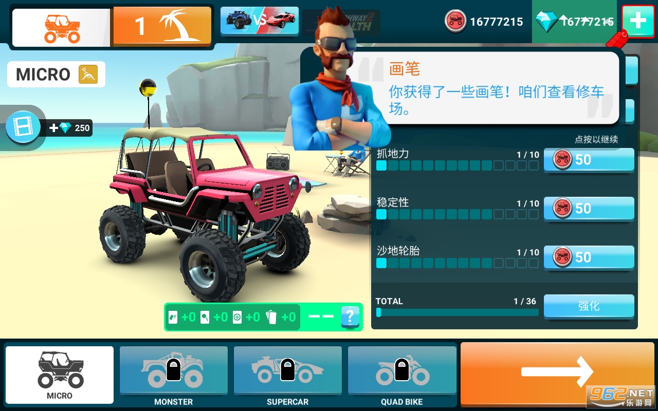 升级你的车,更换更大的轮胎,提高你的速度和获得更多的抓地力;