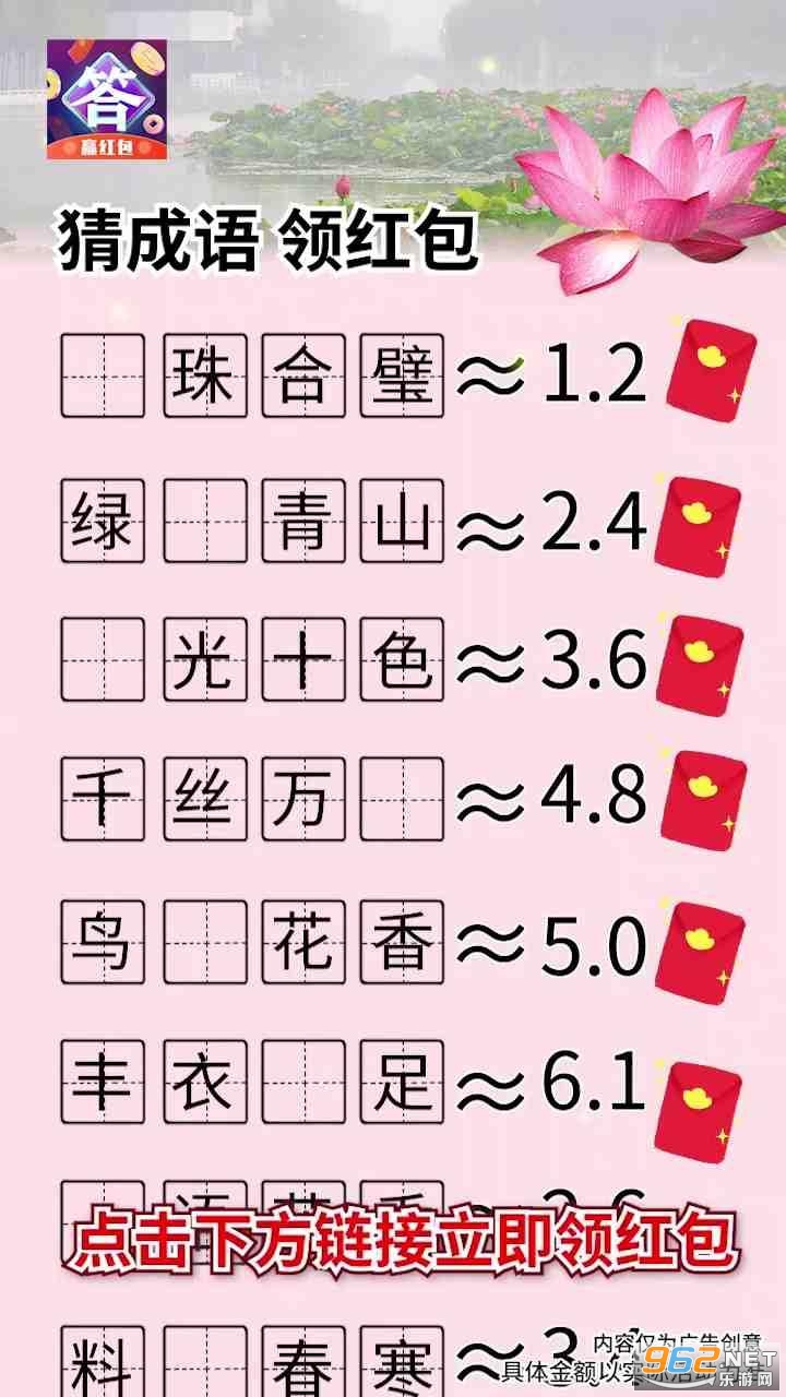 全新的成语答题领红包小游戏,里面拥有海量的成语词汇,玩家可以随意挑战,通过答成语的方式,完成任务,领取红包的奖励,操作比较的简单,既可以丰富你的成语知识,又能随时赚零花!
