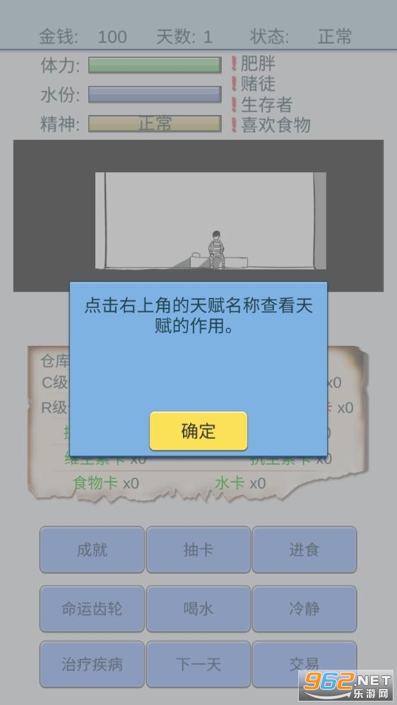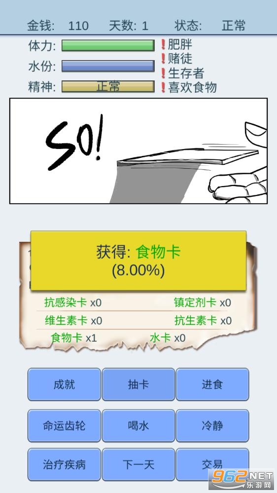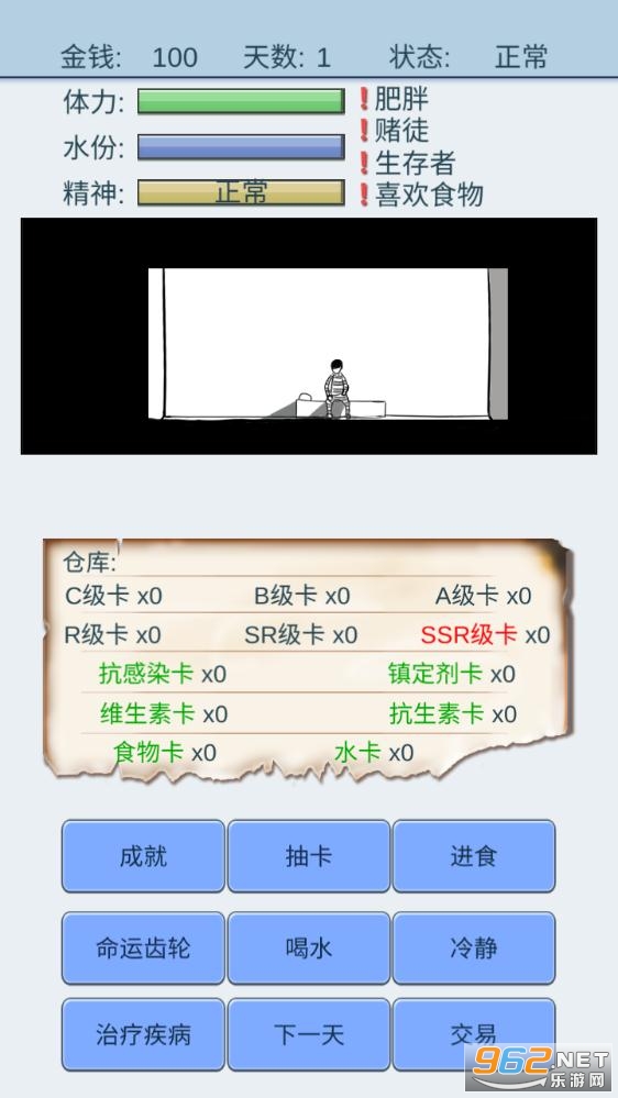 -这也是生存游戏,抽卡的同时记得先让自己活下去,因为你的食物,水,可都是抽卡得来的。你还会生病,记得及时治疗。
