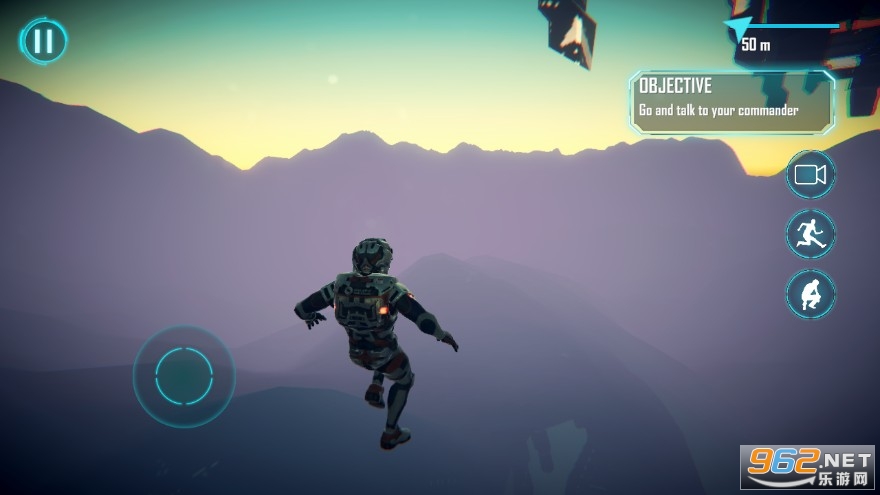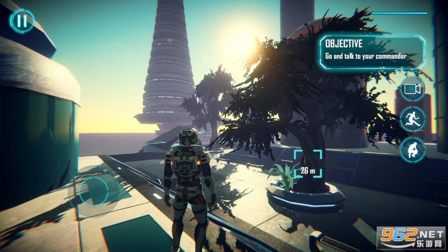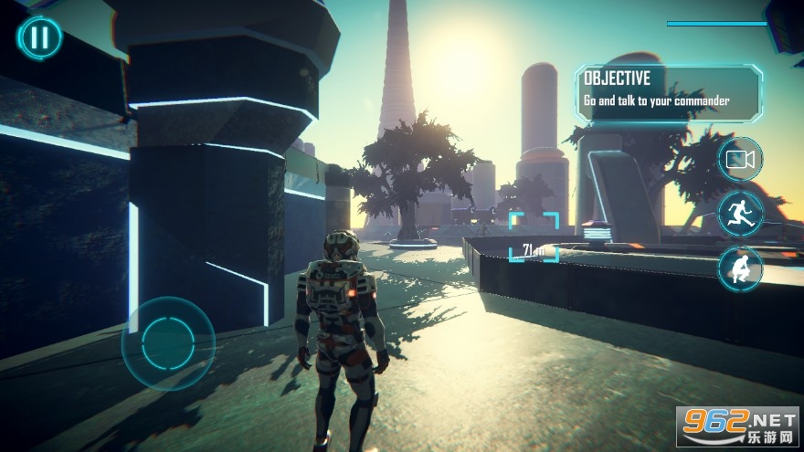 2、3D环境身临其境,第三人称视角,穿着机甲的人在移动,周围的景色很美。