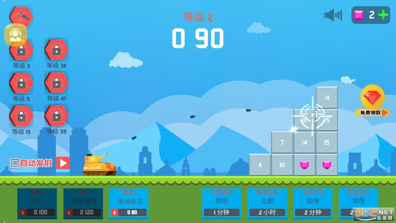 《坦克消砖块》是一款休闲益智的游戏,操作非常简单,很容易上手,无论你是小学生还是大学生,你都会喜欢上这款超级简单又不乏趣味的游戏。游戏中的坦克会自动瞄准砖块,并且自动发射子弹。你可以控制游戏左边的导弹发射,也可以选择自动发射导弹。你需要根据分数来控制游戏下方的功能按钮,提升坦克发射火力和射击速度等,来快速消灭砖块,升级坦克等级,赢得最高的分数。游戏下方的功能按钮需要消耗相应的分数和钻石,你需要不断收集这些,来完成的最终的坦克升级,消灭所有的砖块。