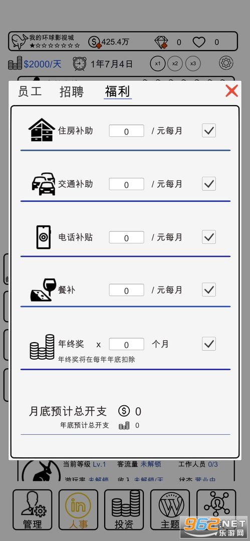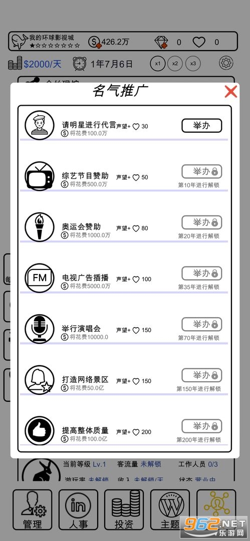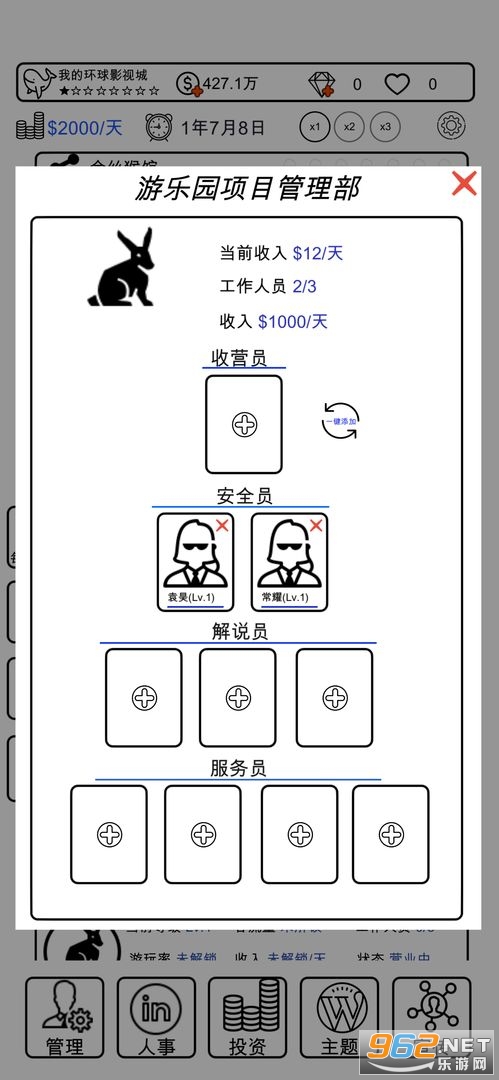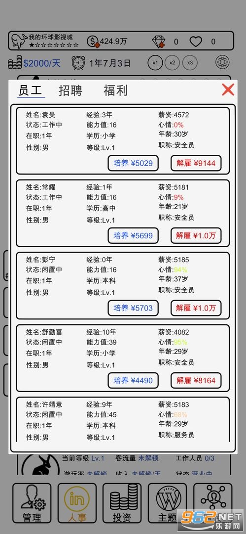 《我的环球影视城》是一款模拟经营主题乐园的模拟现实的游戏,在这里你可以选拔各种各样的人才,可以对他们进行培养并给让他们担当重要的职位。丰富多彩的游乐园主题让你的名气大造,从来给你带来可观的收入和回报,当你有一定的势利后你依然可以进行资本的扩张,从而扩大自己的资本影响力。既《平民崛起记》 《地产大亨》 《航空大亨》嗨皮工作室的又一款独立文字养成类游戏上线啦,欢迎大家进行体验和尝试。