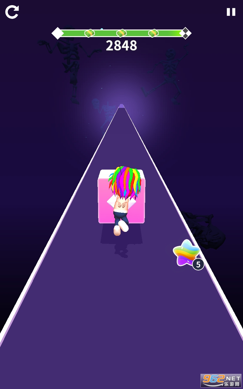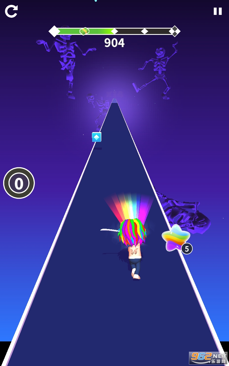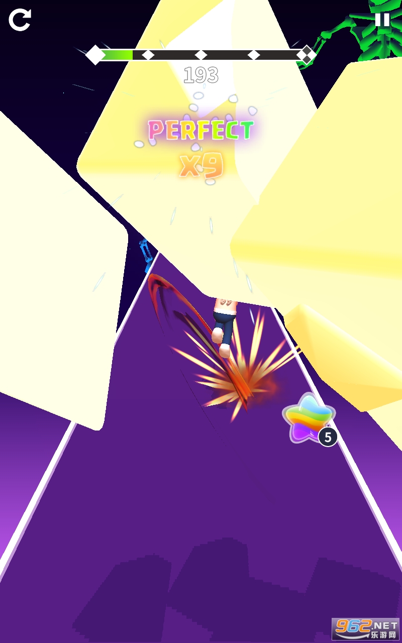 操作非常简单。使用屏幕上的按钮调整人物砍块,躲闪陷阱,跑到最后特色街路。