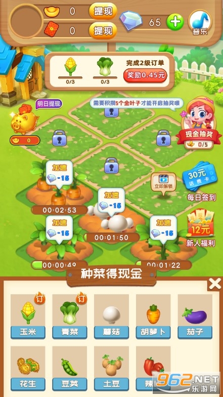 来玩这个能够赚钱的天天农家乐红包版游戏,简简单单几块田,再给你几个初始的种子,让你在这片小天地自由的耕种,不断解锁新的种子和道具,你可以当一个勤劳的农夫,每天兢兢业业,收获的所有水果蔬菜都能够兑换成红包哦。