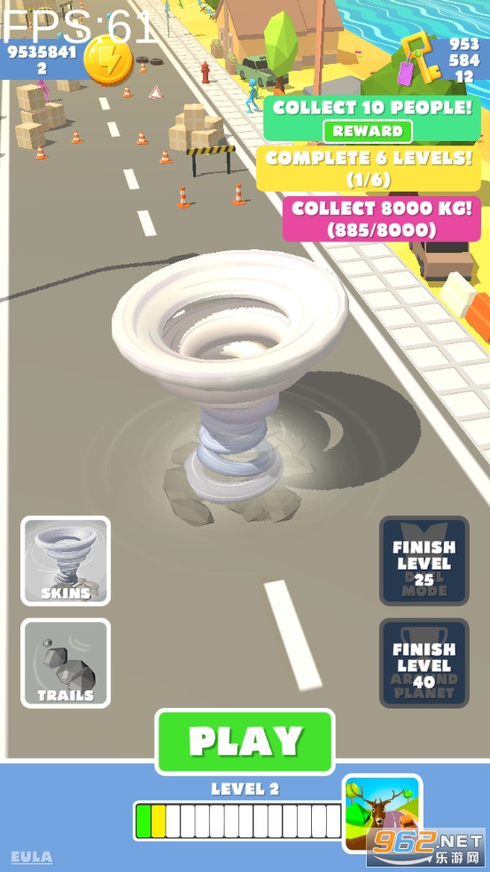 《完美龙卷风》是一款画面清新的控制龙卷风去破坏一切的趣味休闲手游,游戏中有着水果、树叶、岩浆、海水等各种不同类型的龙卷风皮肤,玩家的任务就是控制龙卷风在城镇街道到移动,去吞噬汽车、树木、路灯、房屋等各种物体,一路冲向终点。