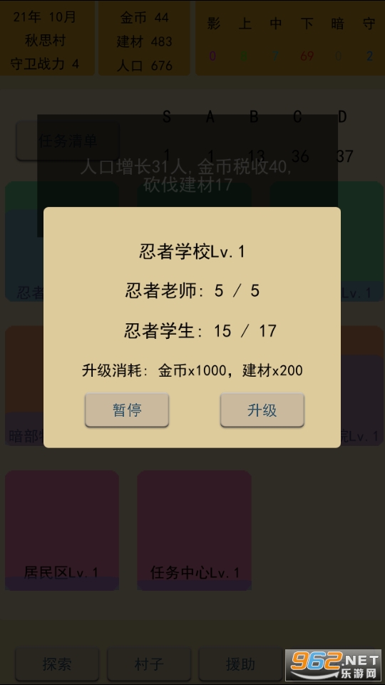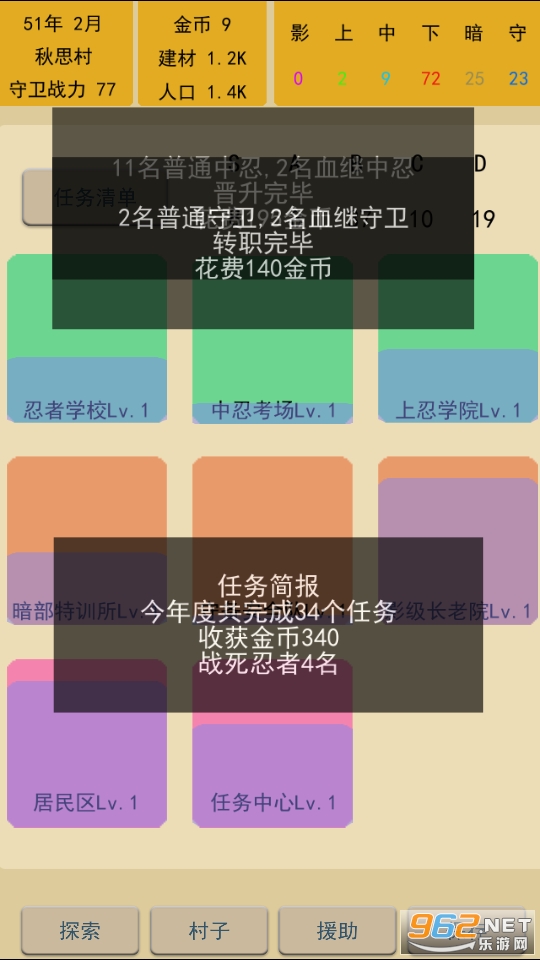 一款放置文字类的休闲游戏,玩家在游戏中管理好你的忍者村就可以了,不断的进行训练升级,让你的忍者村各个部门得到升级,拥有更多的人口,完成任务和援助,快来下载吧!