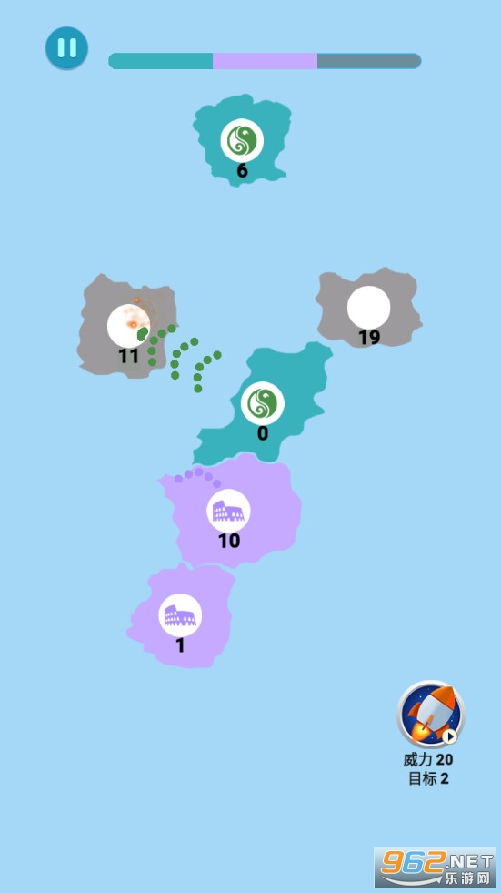 《抢地盘大战》是一款休闲策略对战游戏,玩家可以通过不同策略组合来实现地盘扩展!游戏中你要合理派兵最终将画面中所有地盘为己有即可通过,一起来挑战吧!