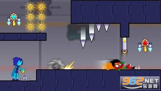 2、只要先让火人在按钮边不要踩也不要隔得太远,然后切换到另一个火柴人,马上让火柴人向前跑,跳到中间的方块上,就可以了。