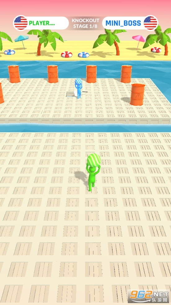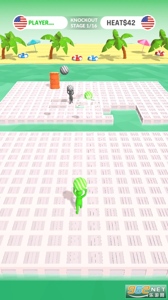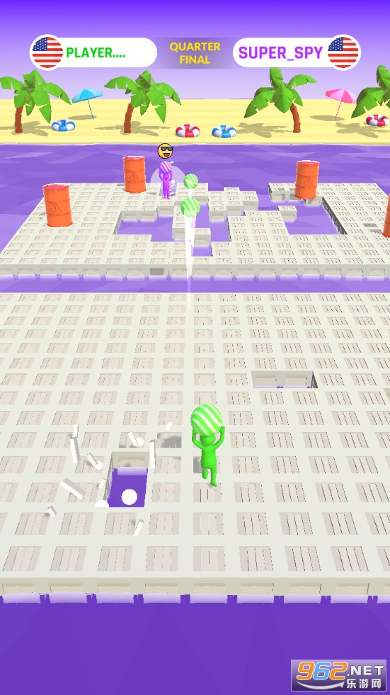 这是一款非常有趣的双人对战小游戏,玩家们要用手中的球来攻击对手脚下的木板,如果能够直接命中的话会获得胜利,用你敏捷的身手来进行躲避吧!地板受到攻击的部分会沉落到水中,接下来你必须小心应对,不要踩空掉下去了,一局比赛一分钟就能够搞定,欢乐的氛围能帮你消磨时间。