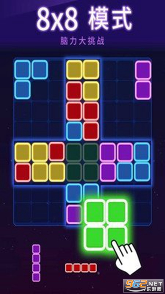 拖动模式:将屏幕下方的三个备选方块拖入宫格中,一行或一列铺满即可消除,直至备选方块无法放置,则消除游戏结束