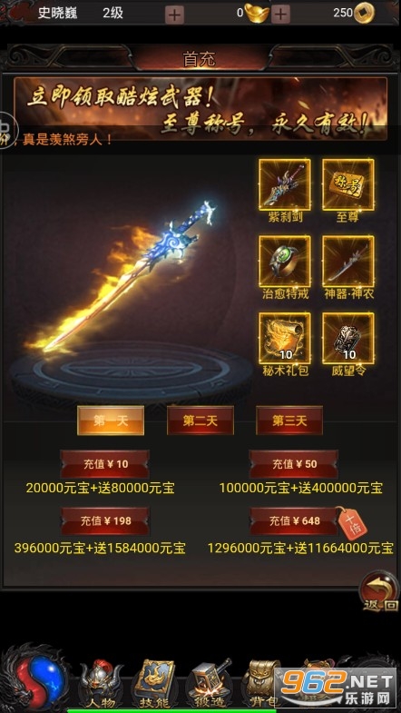 ★充值比例1:2000,激活首冲领取三天奖励,酷炫武器,无双套装,华丽羽翼等高级材料统统拿走;
