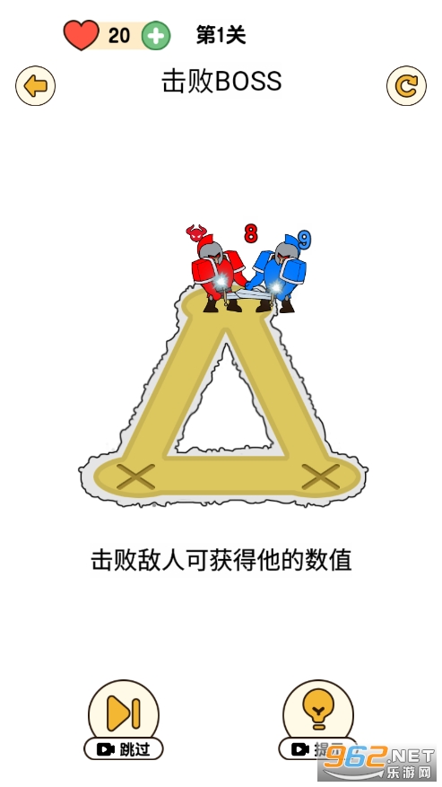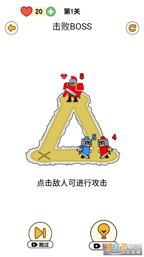 好玩的休闲闯关游戏,拥有过关斩将和IQ大冒险两种玩法模式,画风看起来比较的简约,玩法操作很简单,容易上手,逐渐攻击比自己小的士兵,吸收它的数值,增加战力,完成任务!
