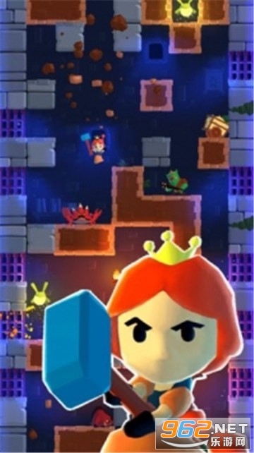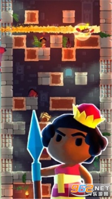 平时柔弱无力的公主在这款游戏摇身一变,拿起武器,不断的向下挖掘土块,打击怪物,破坏障碍物,寻找回到逃出塔的方法。游戏中的怪物类型有很多,比较常见的有不会动,当作障碍物的,萤火飞虫;会跑来砍击你的兽人。