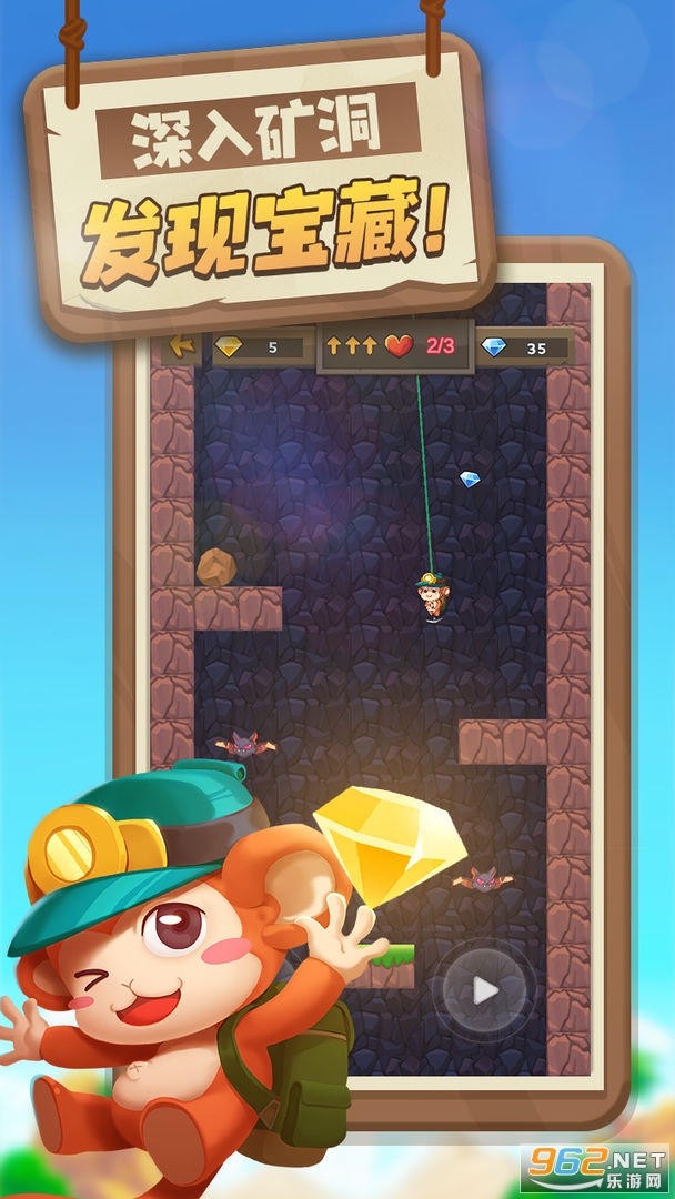 《猴猴矿工游戏》是一款挖矿寻宝的竖版闯关游戏,去探索更多神秘矿井开宝箱寻宝藏,非常考验玩家的反应速度,左右快速移动猴猴矿工,帮助它避开一切危险,在后面的关卡中还能加速减速下井,注意下井绳子的长度,我们所用的绳子长度一定要比矿井的深度更长。