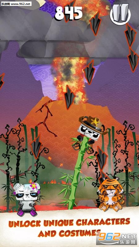 竹林大逃亡是一款动作冒险类的手游,畅享简单有趣的街机风格生存动作游戏,即使是孩子也能轻松上手,所有人都会爱不释手。您能在这个全新酷炫的动作游戏中征服火山,获得最佳表现吗?帮助熊猫Cranky在竹子间穿梭摇摆,躲避从火山中射出的燃烧岩石,在危险环境中生存下来