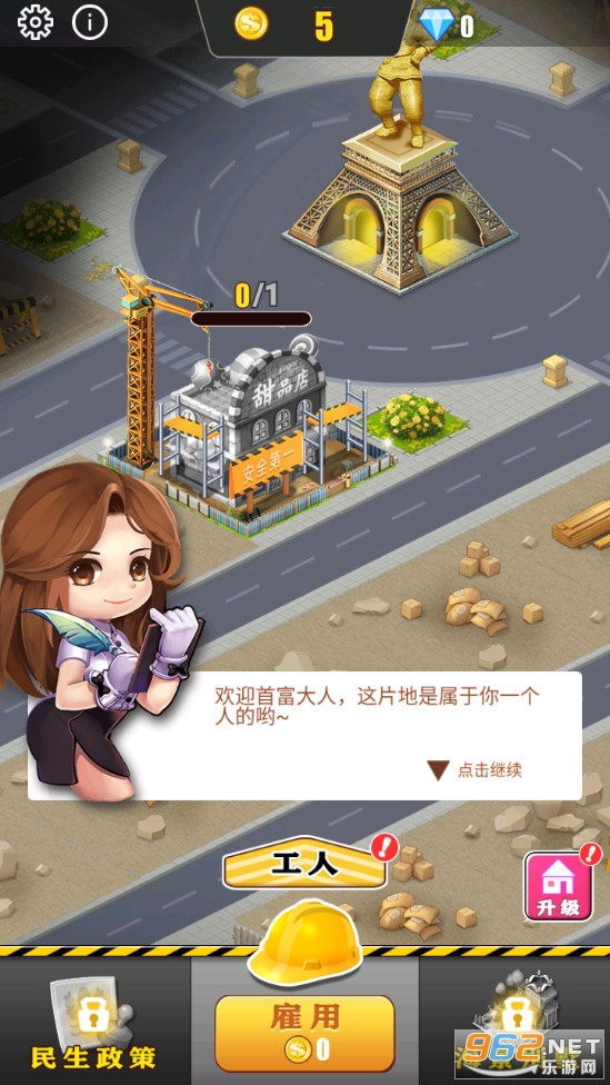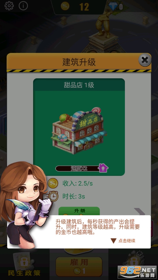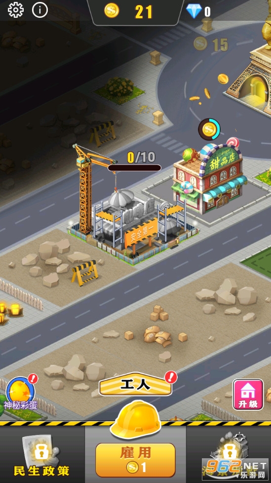 城市经营游戏,玩家可以花费金币来雇佣工人帮助自己建造甜品店、餐饮店等各种各样的建筑,建筑越多收益也就越多,可以用来升级工人属性、升级建筑等,可以建造更多的建筑,喜欢的朋友可以下载试试。
