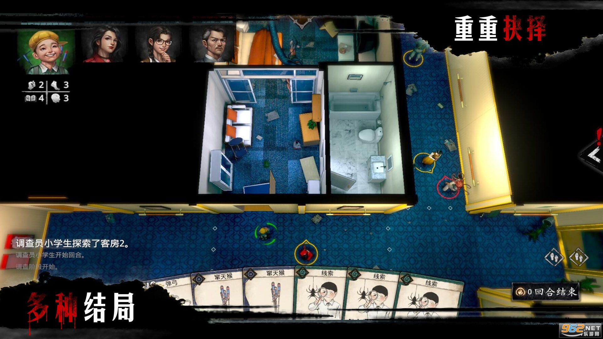 4、根据剧本,玩家将会来到特定的场景中(比如无人的医院、豪华的游轮)。场景被划分为一个个区域和格子,其中分布着大量可调查的线索、可拾取的道具和需要解开的谜题,玩家以回合制轮流行动,不断探索、抉择、检定、推理、战斗。