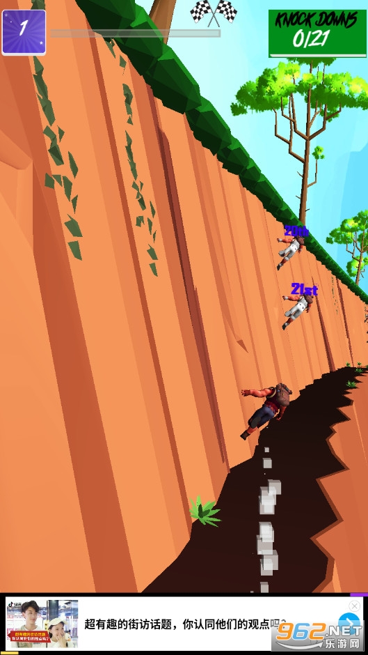 《墙跑游戏》是一款惊险的跑酷闯关类游戏,游戏的全程我们都是在山崖边的崖壁上完成的,每轮参加挑战的选手一共18名,通过触屏划动左右方向来完成跑酷操作,超越前方的对手及时躲避障碍物,完成游戏的挑战即可!