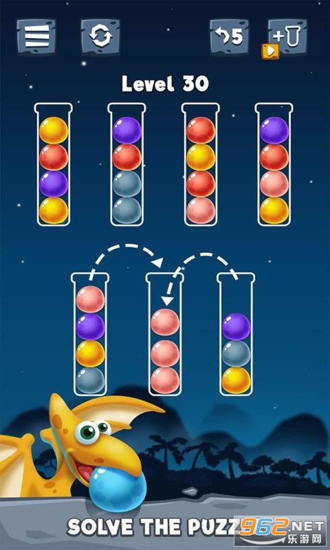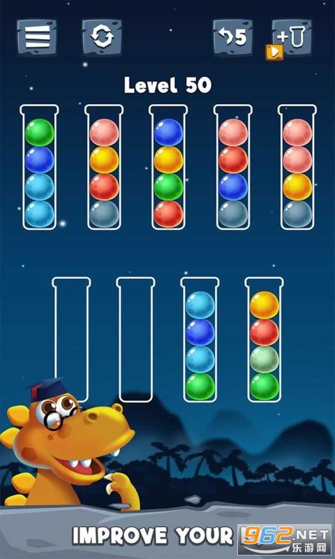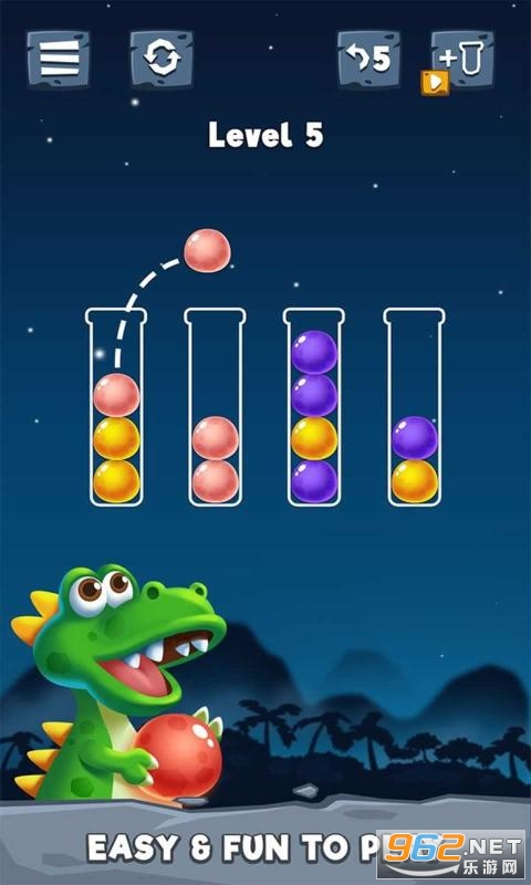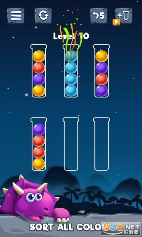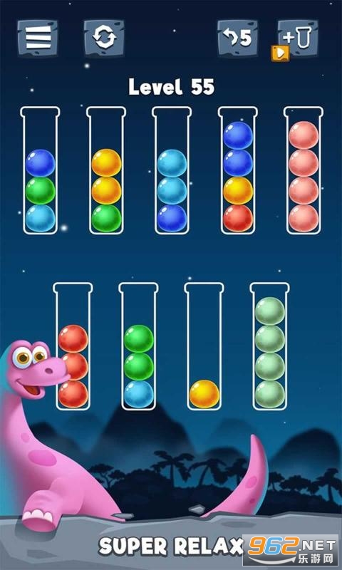 恐龙蛋分类是一款益智类游戏。五颜六色的恐龙蛋被随机放置在管内,你需要将这些杂乱无章的恐龙蛋按颜色分类,相同颜色的放到同一根管内即可。难度随着关卡增加而增加,欢迎下载体验!