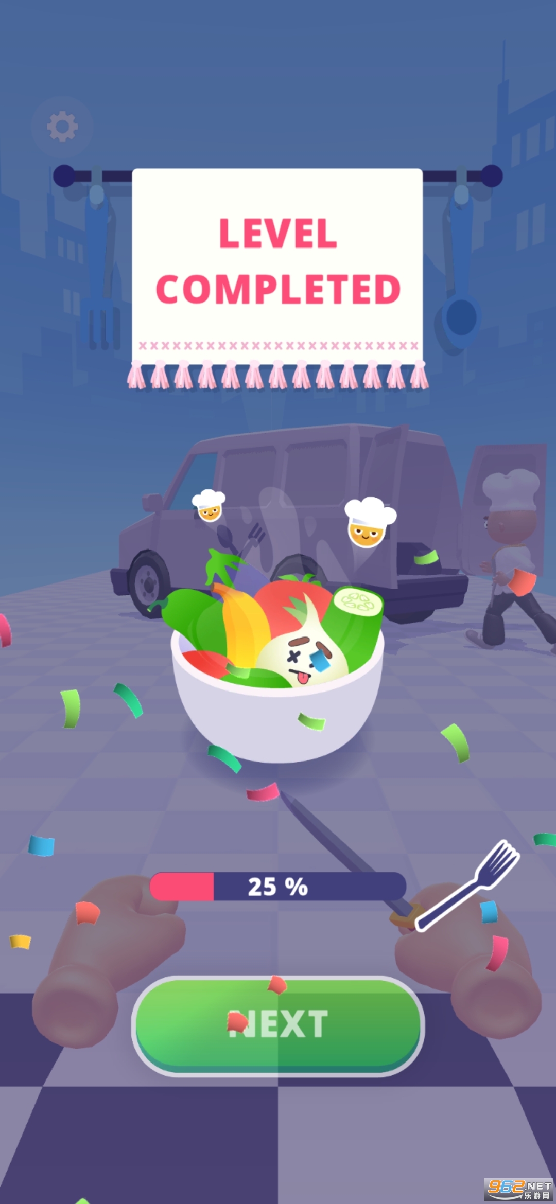 这款闯关游戏还是很精彩的,并且画风轻松魔性,有很多可爱的蔬菜水果怪,它们绑架了厨师,只有消灭掉所有的蔬菜水果才能将厨师救出来,游戏的关卡超多,关卡的难度也会逐渐提升。
