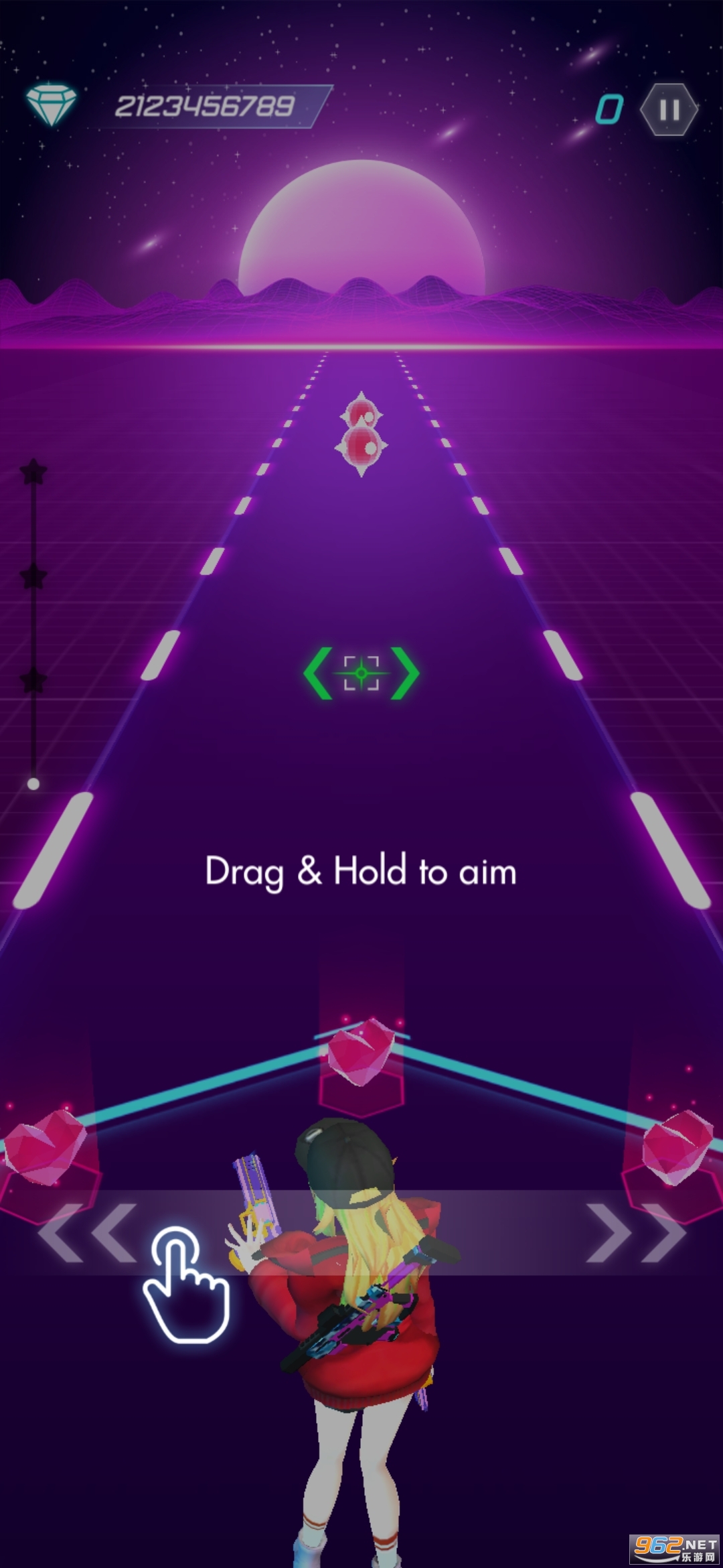1、各种音乐方块正在朝着小女孩的方向袭来,点击屏幕滑动准星,对准方块射击;