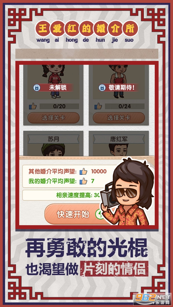 开一间婚介所,最重要的是啥,客源!钻石王老五?高配刘德华?民间嘴炮司机?以及性感的乘务员?数十种人物以及搞笑对白等你来解锁,了解关于他们的爱恨情仇