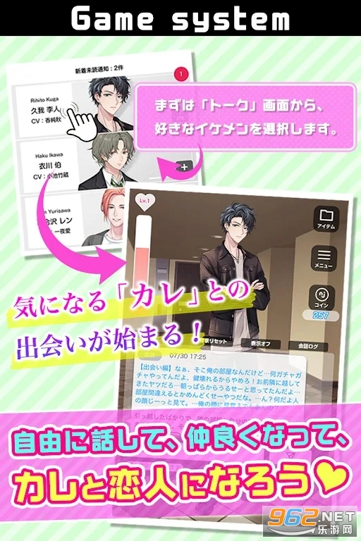 《虹色男友》是一款乙女向恋爱文字模拟游戏,在这款游戏中你将遇到不同性格的美男子开始全新的恋爱之旅,游戏中你可以自由的实时的进行日语对话来体验恋爱的感觉,大概就是会有真人客服来回复你,赶快下载体验吧!