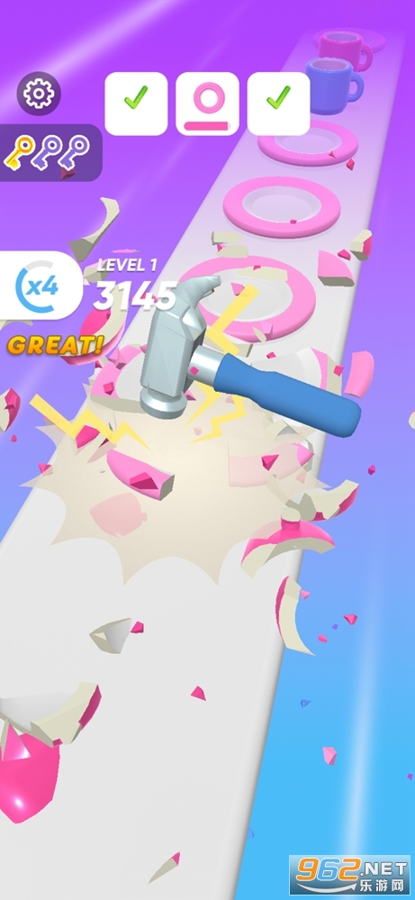 《我砸东西贼准》是一款画面清新的砸碎各种物品的发泄类休闲手游,游戏中玩家可以利用金币去解锁各种锤子去冒险,点击屏幕可以让锤子向下砸落,砸碎杯子、盘子等各种物体,看着飞溅的碎片发泄心中压抑的情绪,游戏以修改,有着大量的金币可以免费使用,轻松解锁各种物品道具。