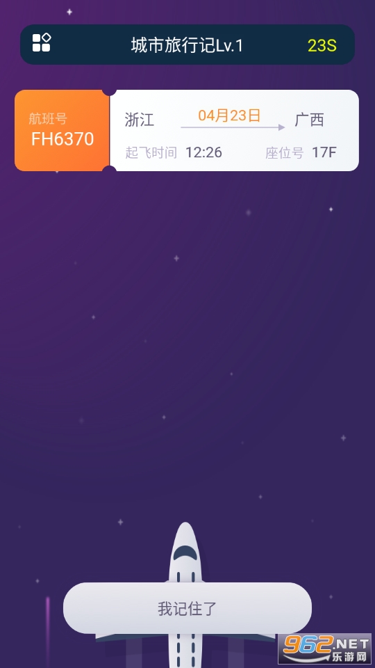 《城市旅行记游戏》是一款考验玩家记忆力的休闲小游戏,操作上很简单,考验玩家的记忆力,你需要在规定的时间内对登机牌上的信息进行记忆,然后系统会选择任意挖空一个点,选择选项完成挑战就可以了。喜欢的话就快来下载吧!