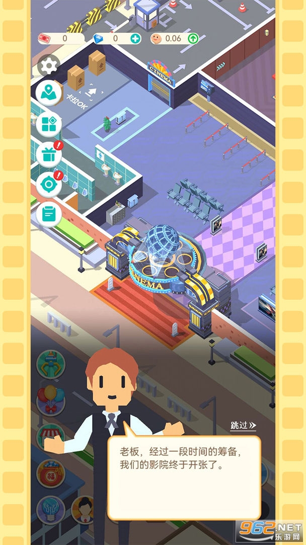 超级好玩的电影院模拟经营游戏,前期的时候是需要一笔很大的投资的,等到自己赚到钱之后就可以继续投资去另外的街道开设电影院,你所经营的电影院一定要有自己的特色,这样才能吸引更多的顾客,才能赚到更多的钱。