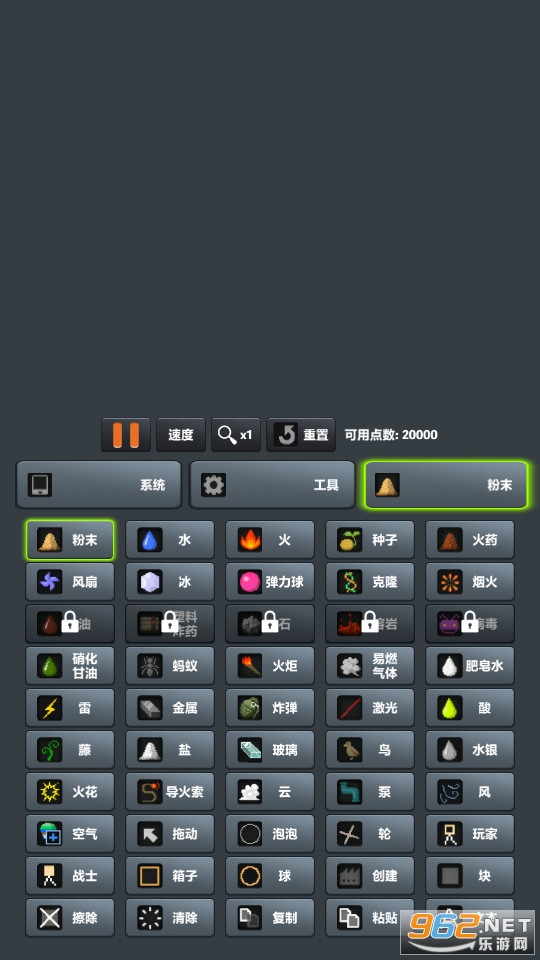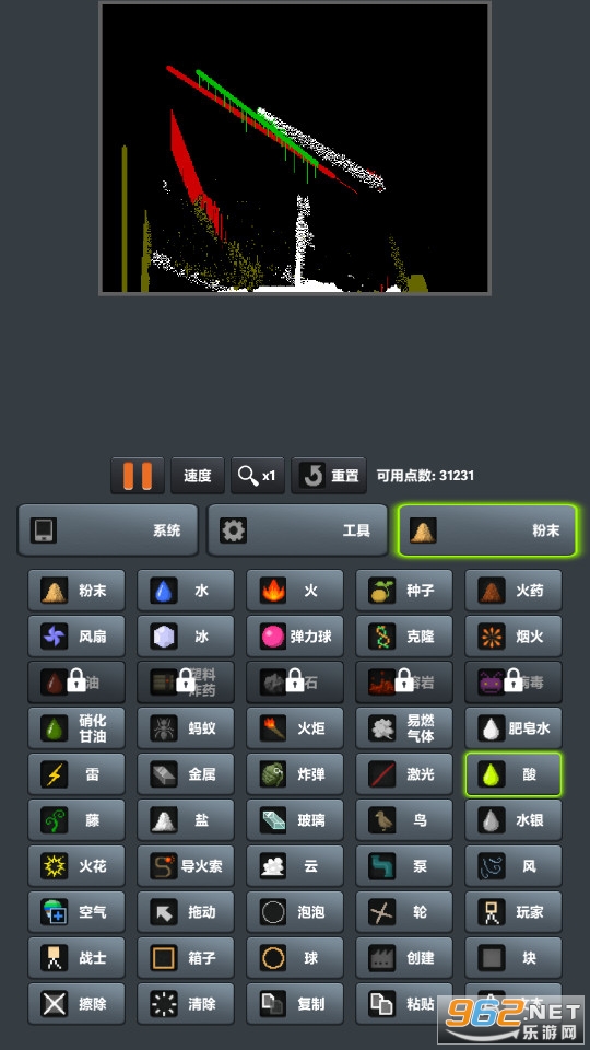 粉末物理模拟游戏,玩家可以自由的选择各种粉末混合在一起来形成不同的化学和物理反应,比如火药和岩浆混合会燃烧,种子、泥土和水会发芽等等,发挥自己的想象去制作各种现象,喜欢的朋友可以下载试试。