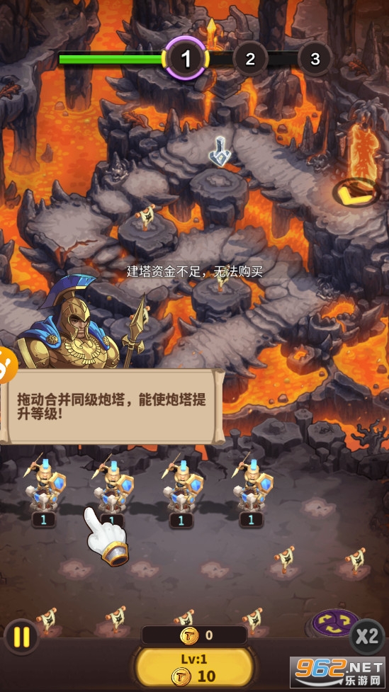两个一星人物可以合成两星人物,以此类推的去进行人物合成守关,每当你成功的击溃两拨敌人的攻势之后就可以多加一座塔防防御设施,击杀一个敌人掉落一枚金币,召唤一位英雄需要十枚金币,所以玩家朋友们加油吧!