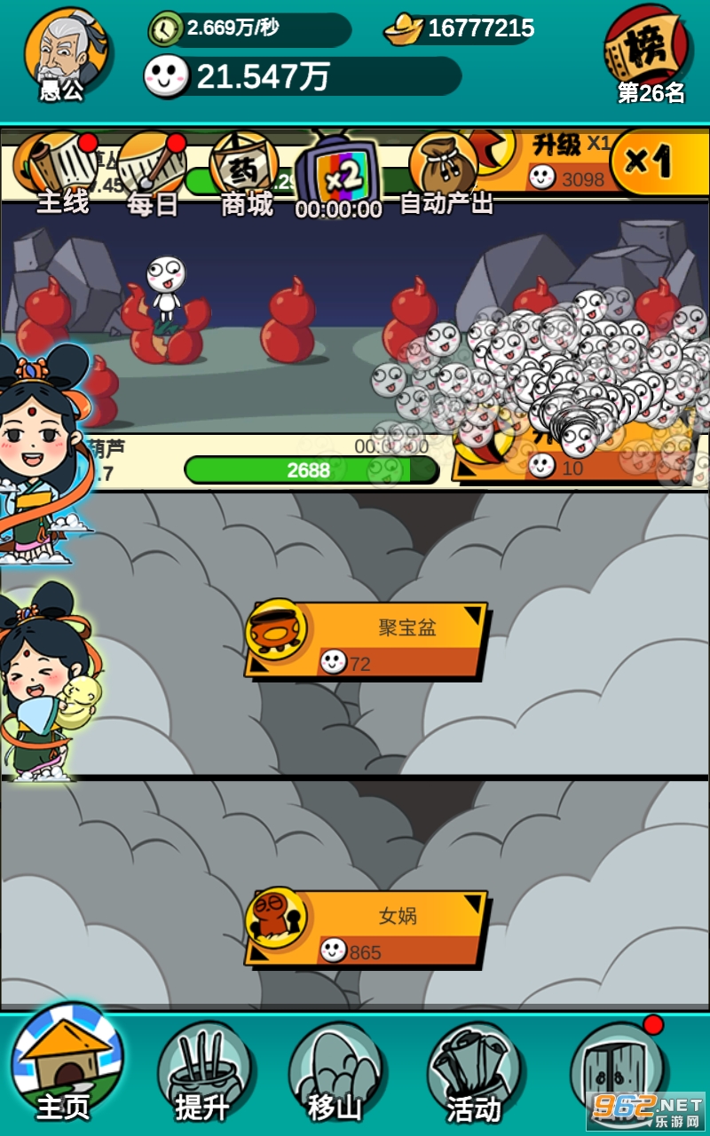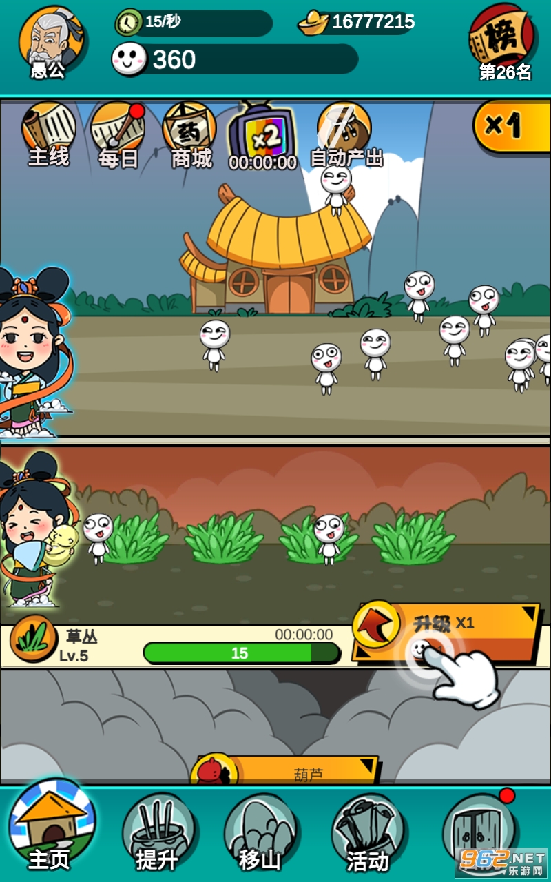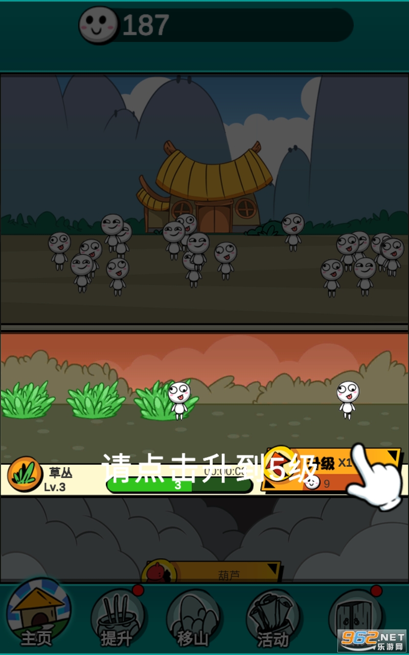 该游戏魔性的画风开启花样生娃,游戏过程中,玩家将通过各种各样的方式来增加愚公的子孙数量,并根据移山过程中的开采,获取宝石,提升各种生娃的效率,期间你既可以通过连续的点击来增加子孙的出生效率