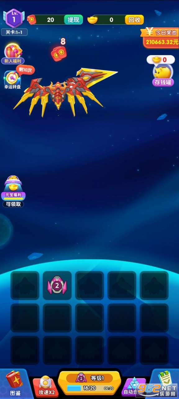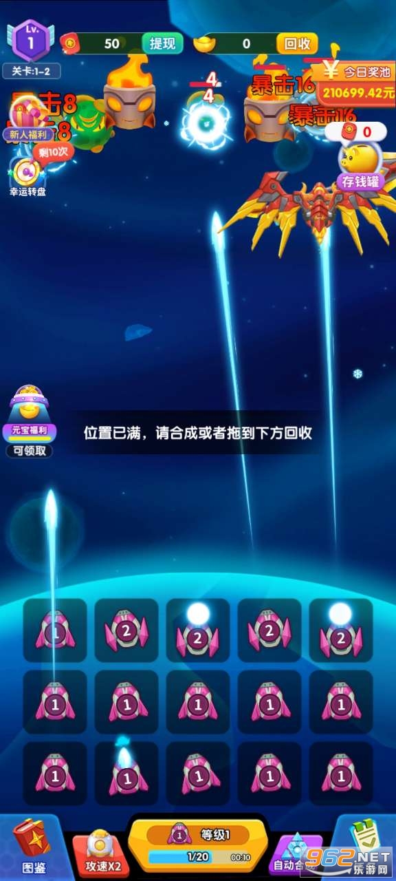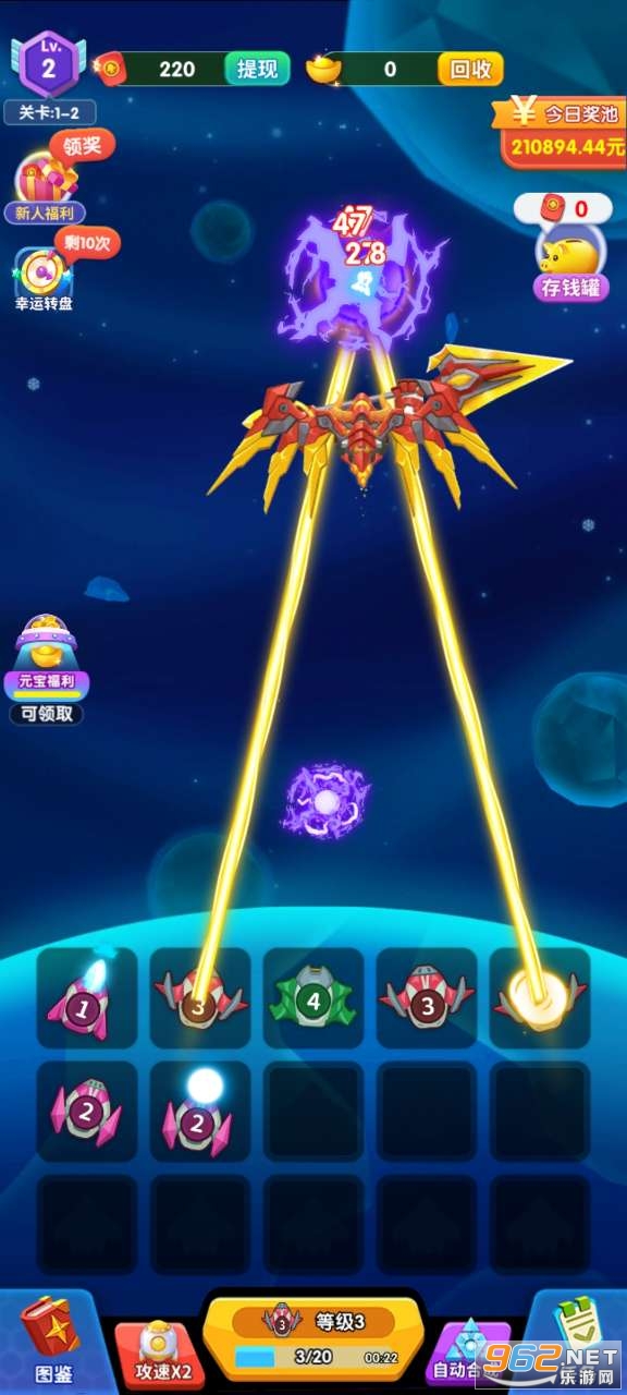 1. 游戏中简单地合成放置玩法,轻松升级战机,升级射击速度和战斗实力。