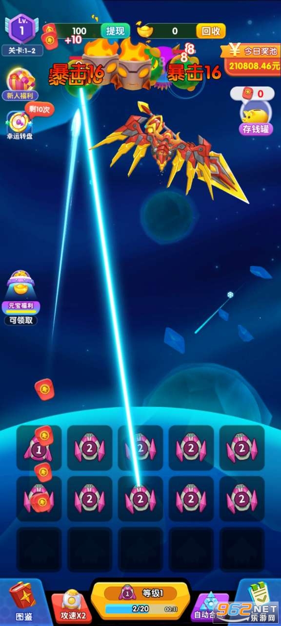 一款轻松有趣的放置合并玩法,玩家将不断的升级你的炮塔,同时你还可以强化你的战机,游戏的操作简单容易上手,你的阵地将不断的发射各种激光消灭敌人,游戏的玩法轻松有趣,推荐给喜欢休闲游戏的玩家。