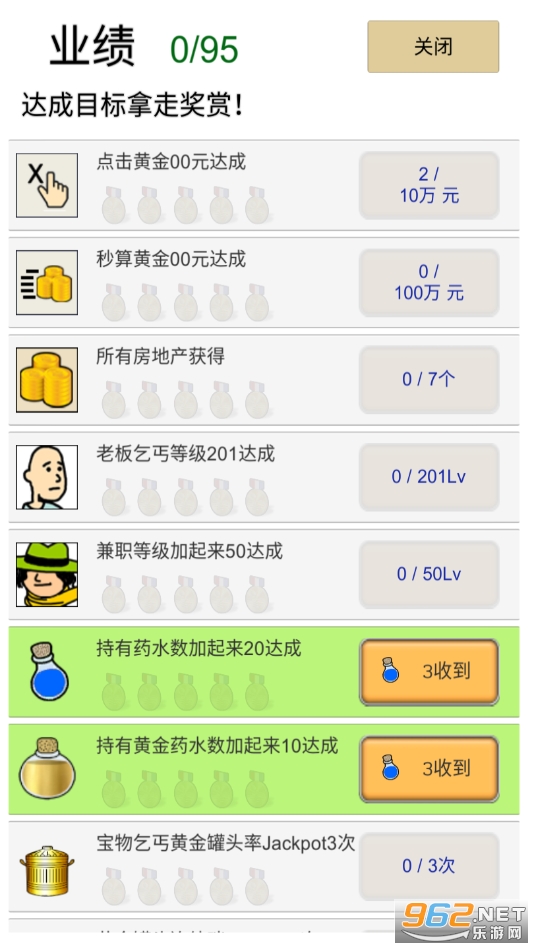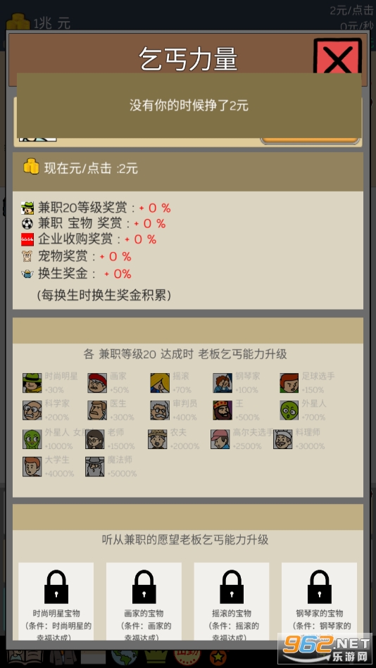 《乞丐生活模拟器无限金币药水版》又名《养乞丐》。是一款比较有意思的点击式休闲放置游戏,在游戏开始玩家将从一名乞丐开始自己全新的人生,以点击的形式在游戏中做兼职,赚钱,收集各种卡通卡,购买和拍卖艺术品以及豪宅,逐渐走向致富人生路,操作比较的简单,内容精彩丰富,感兴趣就下载吧!