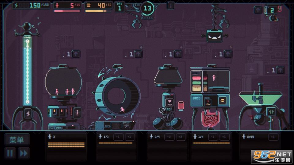 核心游戏体验主要是通过机械爪在多个设施之间传输人类。人类在一个设施中休息,在另一个设施中工作。小人会为我们生产能量(而能量会不断泄露),他们还需要繁殖和生产食物喂饱自己。玩家需要提前做好战略规划,留意人类的状态,防止他们过劳死。最主要的roguelike元素是玩家无法存档——每次流程都要从头开始。除此之外,游戏中每五次喂食都会发生一个以文字形式表现的随机事件。正确的选项会提供一些奖励,至于错误的嘛——亲自体验一下吧!通过随机事件获得的很多修正因子会显著改变游戏的外观。