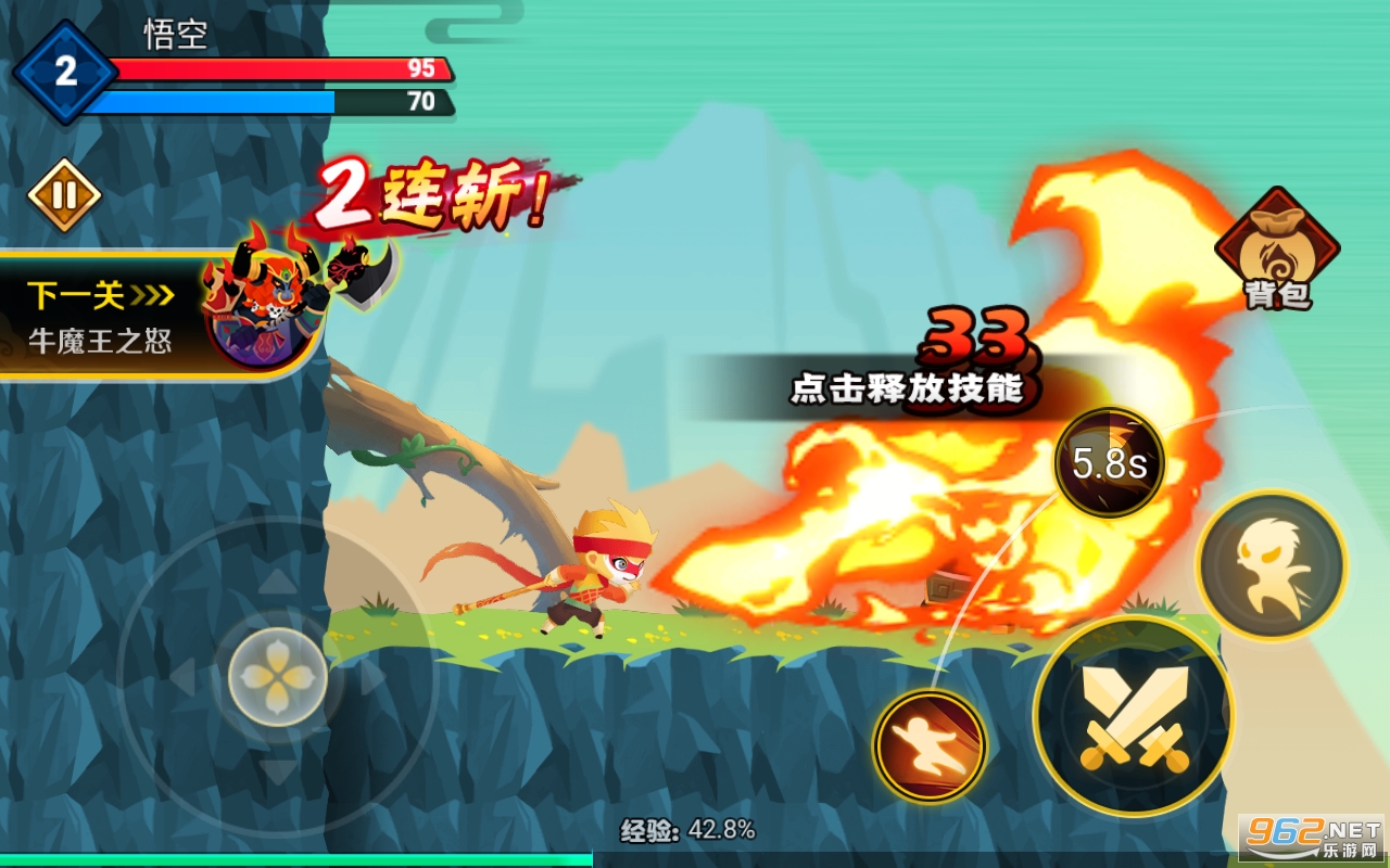 2、Boss挑战多样,角色技能丰富; 游戏中的角色技能有裂空击、五味真火、狂应乱舞等酷炫技能。