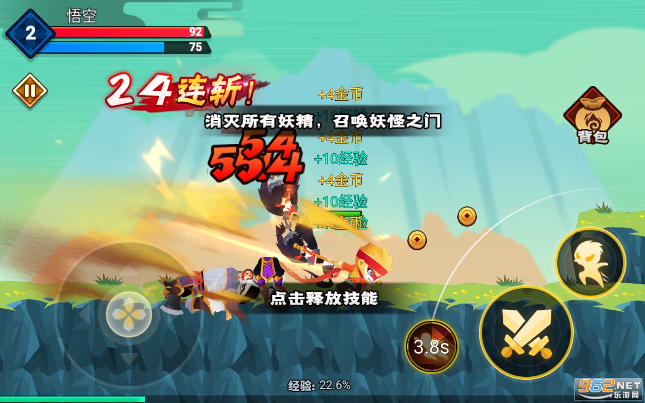暴揍小精灵,一款画风精良的横版动作游戏。游戏中玩家扮演孙悟空的角色,在行走的旅途中遭遇黑熊、牛魔兽、野鸡等各类神兽的追击,通过击杀,技能解锁和升级等一系列动作消灭神兽,完成闯关大挑战,不断解锁新章节。